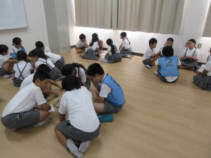 はじめに持ち物や服装についてのお話を聞いたあと、3・4年混合の班に分かれて、めあてや遊び、並び方について話し合いました。