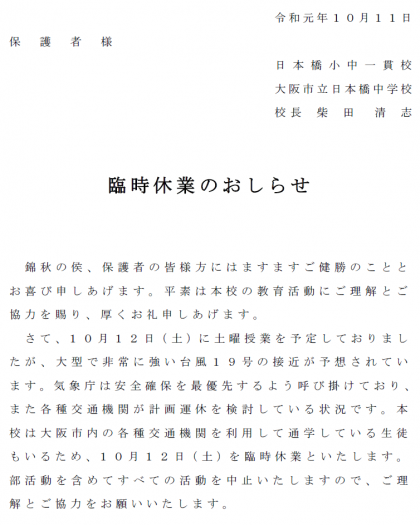 【中学校】明日の土曜授業は臨時休業です。