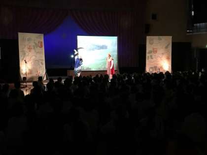 劇団の方を招いて、小学校で芸術鑑賞会を実施しました。映像や音楽と影絵とを組み合わせた本格的な演劇を見せてもらいました。