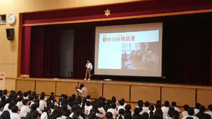 今朝の児童集会は、図書委員会からの発表です。