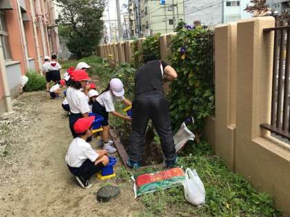 お互いに協力しながら自分の植木鉢に球根を植えていきます。