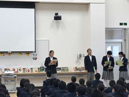 今日の全校集会では各委員会から後期と11月の目標を発表してもらいました。