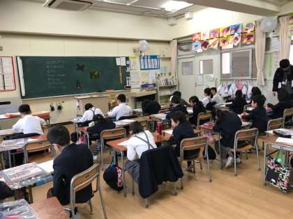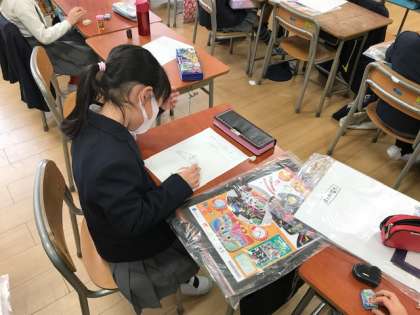 2年生の図工では、ステンドグラスの製作をしています。黒い段ボールを切り抜いて色セロハンを貼り付けて…