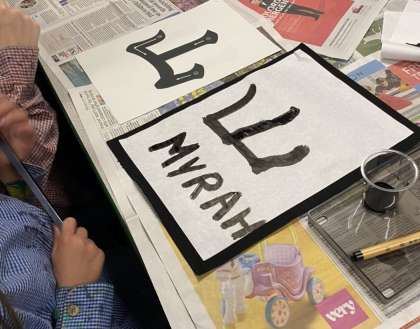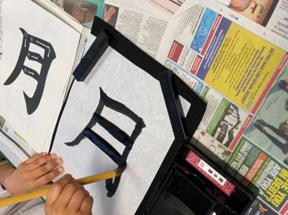 まずもう一人の先生が日本と日本文化についてパワーポイントを使って説明、次に私が10〜12月に撮りためた浪速小学校の様子をパワーポイントと動画で日本の小学校について説明しました。とても真剣に聞いてくれて、給食を自分たちで配膳するところでは、「わあ、すごい!」と言い、自分たちで掃除する場面では、「えー、自分たちでするの?嘘だろう?」って反応してました。そこですかさず校長先生が"Nice idea!"て言ったものだから、みんな"No---!"と一斉に反応していました。その後の習字体験では、児童はとてもお行儀が良いので墨をこぼしたりせず、初めてなのに上手に書いていました。