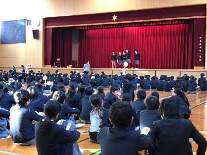 たてわり班でクイズの答えを考えています。全問正解に向けて、みんなで協力!!