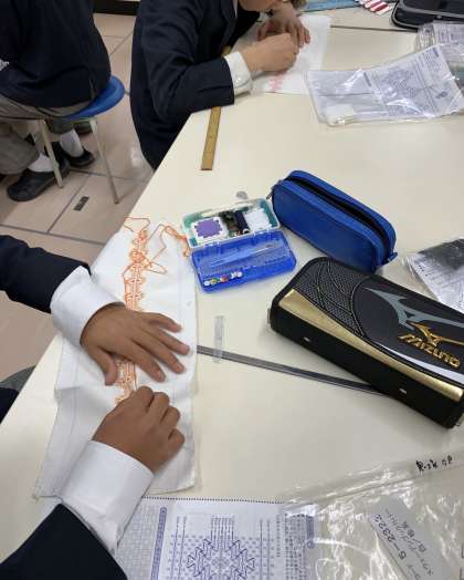 8年生の家庭科では手縫い、運針の練習のためにスウェーデン刺繍をしています。