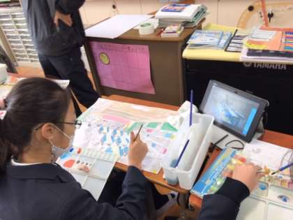 思い出の場所をそれぞれタブレット端末で記録し、遠近法の技法を使いながら作業を進めていきます。