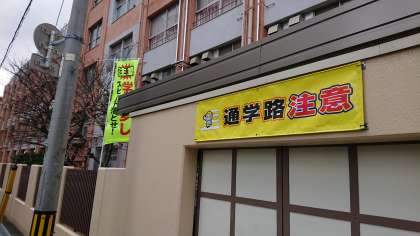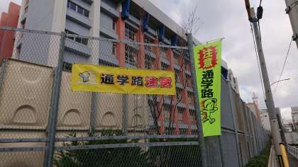 区役所のご尽力と学校との連携で、横断幕とのぼり旗を設置しました。