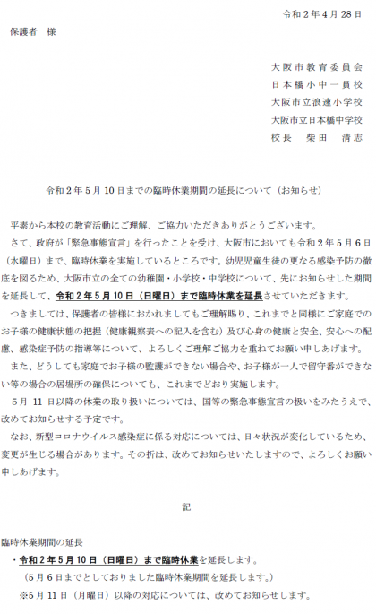 5月10日までの臨時休業期間の延長について