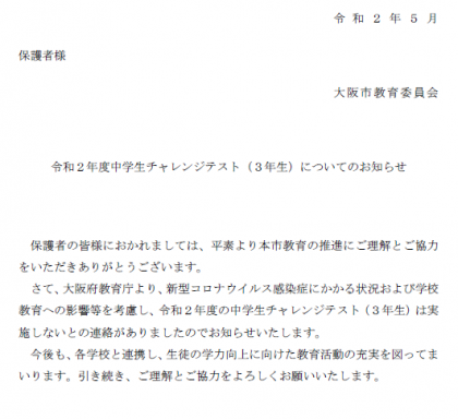 すでに報道発表でもありましたが、9年生(中学3年生)を対象としたチャレンジテストが中止になりましたのでお知らせします。