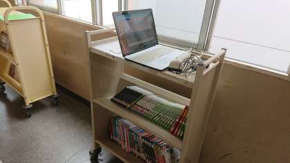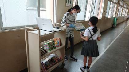 図書館補助員の先生が、ブックトラックで各学年の廊下まで本を持ってきてくれます。もちろん廊下で貸し出しもOK!