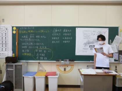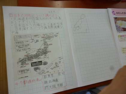 日本地図を見ながら、日本は北海道、本州、四国、九州の4つの大きな島からできていることを確認しました。