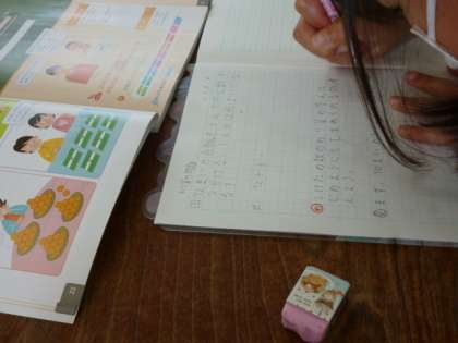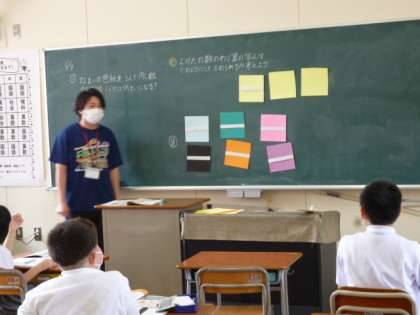 今日の問題は「72枚の色紙を3人で同じ数ずつ分けると、1人分は何まいになるだろう?」です。黒板に貼られた色紙の掲示物を見ながら、みんなで2けたの数のわり算の答えの求め方を考えました。
