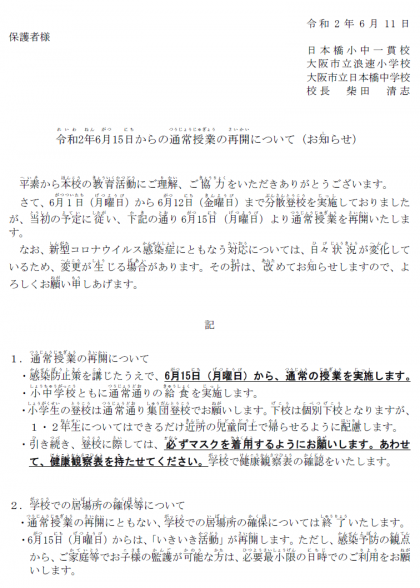 令和2年6月15日からの通常授業の再開について