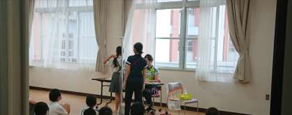 いつもより広い部屋で、待つ場所に印をつけ、対策を講じて実施しています。