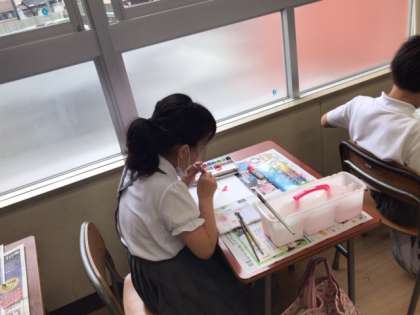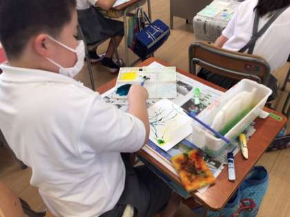 4年生の図工の授業で、色々な技法を組み合わせた作品作りに取り組んでいます。