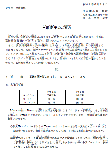 【9年生の保護者の皆様へ】土曜授業のお知らせ