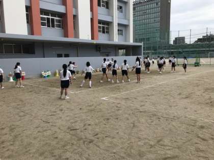 8年生の女子は体力テストの測定が終わった後、全員参加でドッジボールで楽しんでいました。