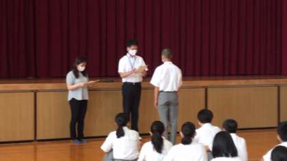 中学校の全校集会で、今年度前期の生徒会執行委員と各学級の各種委員会の認証式を実施しました。