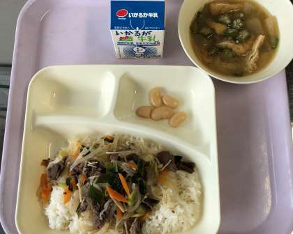 今日の給食は牛丼、とうがんのみそ汁、大福豆の煮もの、中学生はヨーグルトがつきました。とうがんはこの時期だけ使用できる旬の野菜です。みそ汁の具に使用することでどの学年もよく食べていました。