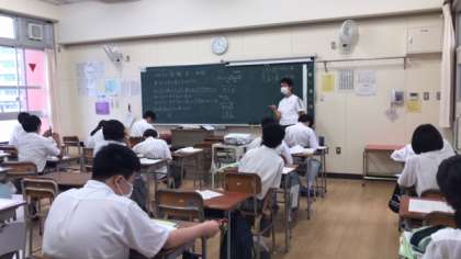 今日は「速さ、道のり、時間の関係」を考え、連立方程式を利用して答えを導き出します。非常に難しい内容でしたが、しっかりと話を聞いて問題を解くことができていましたね。