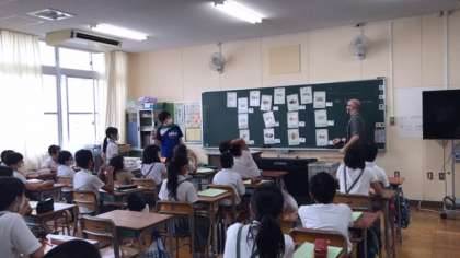 6年生の英語で、中学校の先生とC-netの先生が授業に来てくれています。