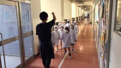 1年生の給食当番がきっちりと列を作って給食室まで来てくれました。