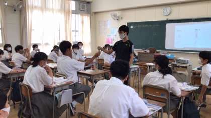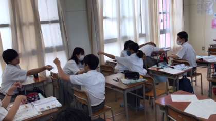 写真の場面は、視野についてペアで実験をしている場面です。