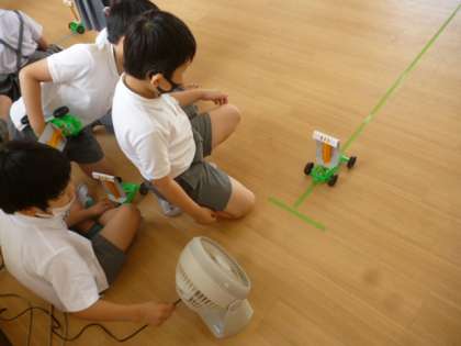 うちわと扇風機を使って、車に風を当てて、車が動いた距離を調べました。