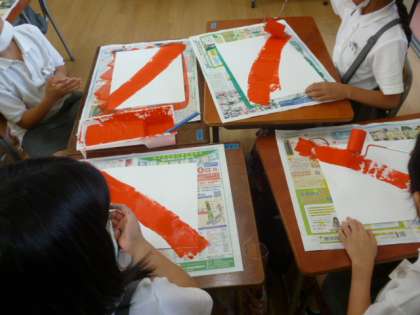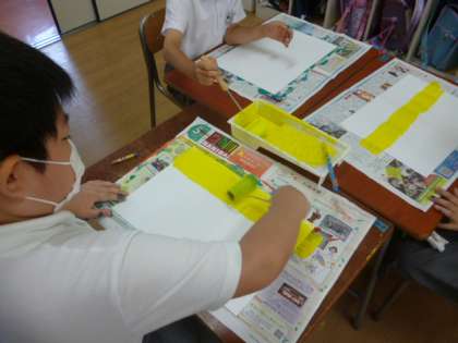 今日はローラーを使って、画用紙に色を塗りました。