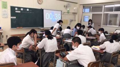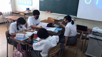 2時間目は8年生の英語です。不定詞の3用法について確認した後、1つの絵について3つの用法を使って様々な表現ができないかとグループで意見交換をしました。