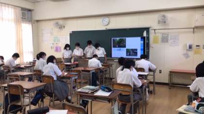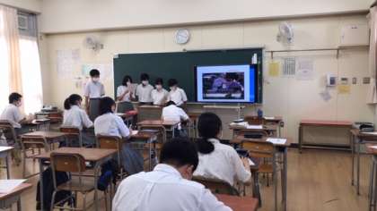 8年生の社会で班ごとにまとめた調べ学習の内容を発表をしています。