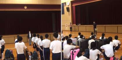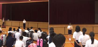 体育館で出発式が行われています。今年度は近畿日本ツーリストの添乗員さんにお世話になります。