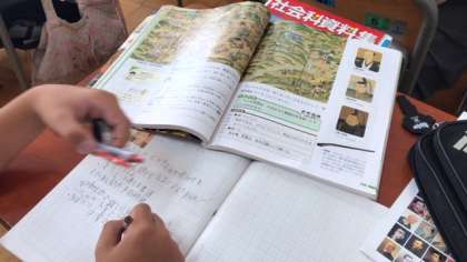 今日は織田信長について調べ、出身地や桶狭間の戦いの特徴などについて教科書の内容を確認しながらノートにまとめていました。