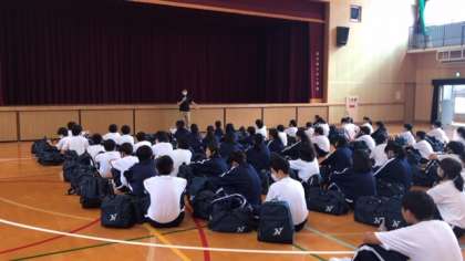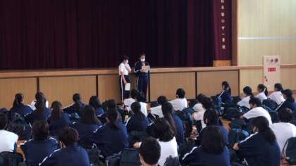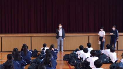 体育館で出発式を行っています。生徒たちの司会で進行していきます。