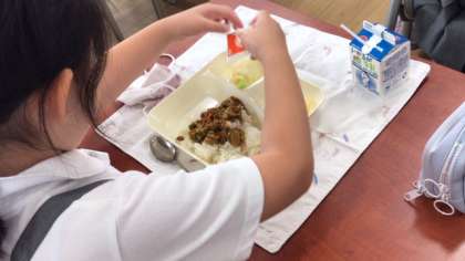 今日の給食はキーマカレーです。みんなで協力して準備し、おいしくいただきました!