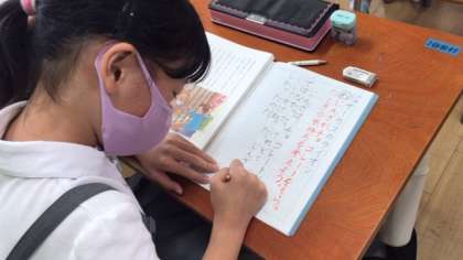 今日は、じんざがチョコレートをもらったときの気持ちについて、気づいたことを発表し、ノートにまとめていました。