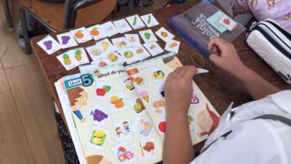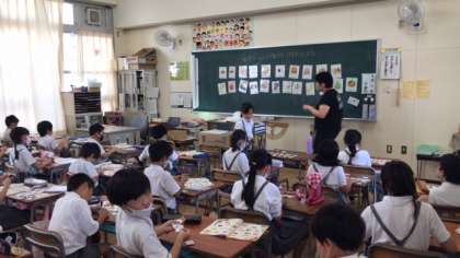 3年生の英語で好きなものをたずねたり答えたりする学習をしています。カードを使って楽しく取り組むことができました。