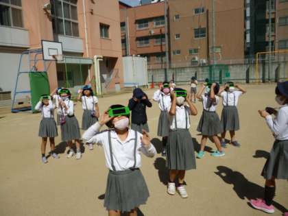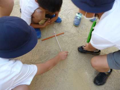 理科で、しゃ光板を使って太陽を見る実験と日かげの土の温度をはかる実験をしました。