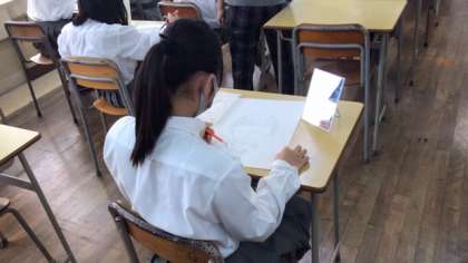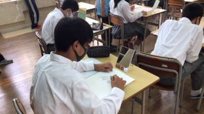 7年生の美術で、自画像を描いています。