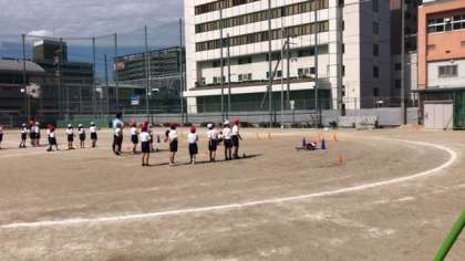 2年生の体育で、バーの下をくぐったり、コーンを回ったり、いろいろな動きを試しながら、楽しく体を動かしています。