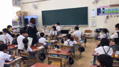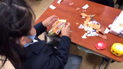 1年生の図工で、いろいろな素材を組み合わせてみのむし作りに挑戦しています。それぞれ個性のある作品が出来上がっていました。