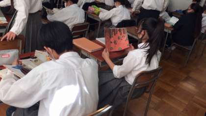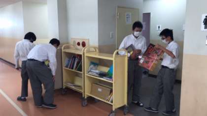 写真は7年生の活動の様子です。どの生徒も自分で選んだ絵本を真剣に読み込んでいました。