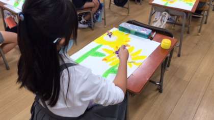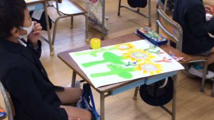 ひまわりの中で遊ぶ3人の小人たちを表現するのがテーマで、どの児童も画用紙いっぱいに作品を描くことができていました。