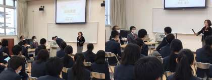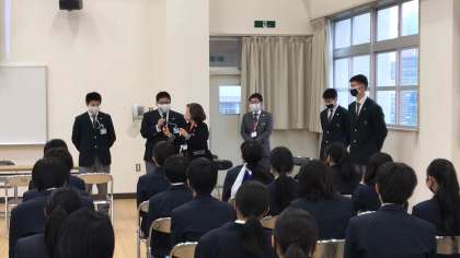 全員で座り方や立ち方、挨拶の仕方など、面接のときに大切にしなければならない基本事項の確認をしました。模擬面接では、現役の高校生が素晴らしい見本を見せてくれ、代表生徒2名も実際に模擬面接の体験をさせていただきました。
