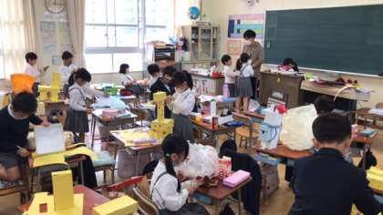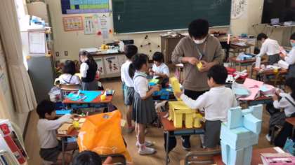 いろいろな大きさ・形の箱を組み合わせて、画用紙をうまく切って糊付けしていきます。