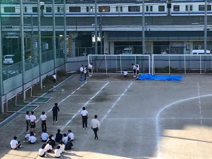 7年生の体育で、走り幅跳びの記録測定をしています。