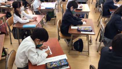 登場人物になりきってセリフを読み上げ、作品の世界に入り込んでいきます。授業の後半では、短冊に自分の考えや気持ちをしっかりと書くことができ、全体で共有していきました。