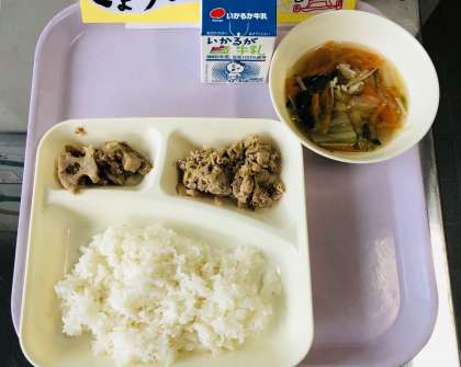 今日の給食は豚肉のねぎじょうゆ焼き、すまし汁、れんこんのおかかいためでした。