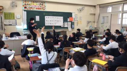 3年生の英語で、アルファベットの大文字を書く練習をしています。